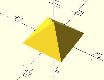 Через эту функцию можно задать любую поверхность. На практике используется редко. Почему? Думаю поймёте сами. Постройка пирамиды. Что требуется? Задать все вершины фигуры (points) в координатах [x, y, z]. Затем объединить в группу по 3 - получить треугольники, играющие роль граней (faces) многогранника. polyhedron( points=[ [10,10,0], [10,-10,0], [-10,-10,0], [-10,10,0], [0,0,10] ], faces=[ [0,1,4], [1,2,4], [2,3,4], [3,0,4], [1,0,3], [2,1,3] ] );Точки (points) с координатой z=0 - это вершины основания пирамиды, a последняя с x=0, y=0, z=10 - это пик пирамиды. Грани (faces) [0,1,4], [1,2,4], [2,3,4], [3,0,4] - это боковые треугольные грани, а последние две [1,0,3], [2,1,3] задают квадрат основания. Цифры в квадратных скобках, говорят какие точки объединить. Соответственно точки по порядку их следования 0 -> [10,10,0] , 1 -> [10,-10,0] и т.д. |
